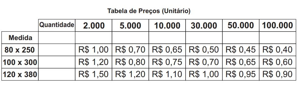 - Os adesivos podem ser produzidos nas quantidades e medidas abaixo relacionadas: